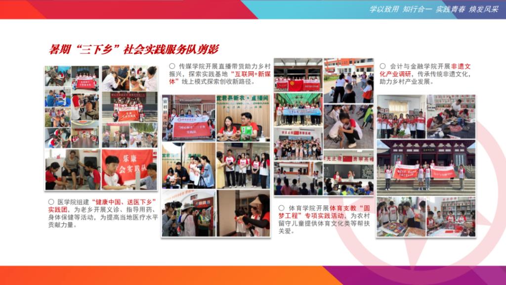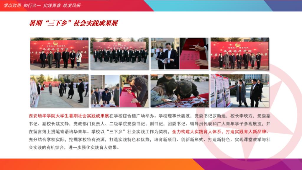 习近平总书记寄语广大青年,“要坚定不移听党话、跟党走,怀抱梦想又脚踏实地,敢想敢为又善作善成,立志做有理想、敢担当、能吃苦、肯奋斗的新时代好青年”。这是党对青年的殷殷期盼,这是国家对青年的深深呼唤。学校以学生发展为中心,着力打造“专业+实践”的培养模式,将社会实践项目化、基地化、社会化,鼓励培华青年立足实践,走进基层,将青春汗水挥洒在祖国大地上,谱写属于培华青年的时代华章。