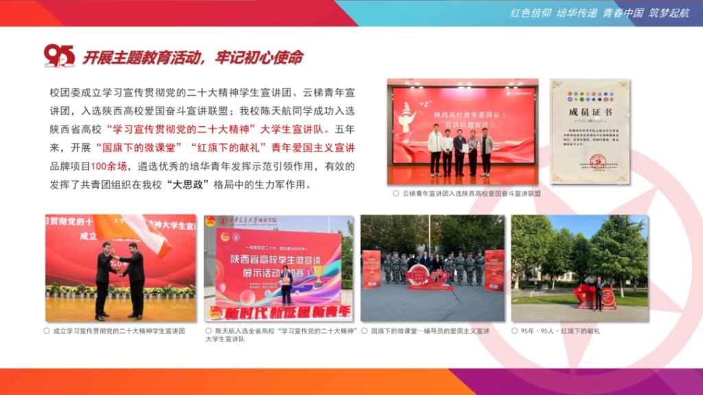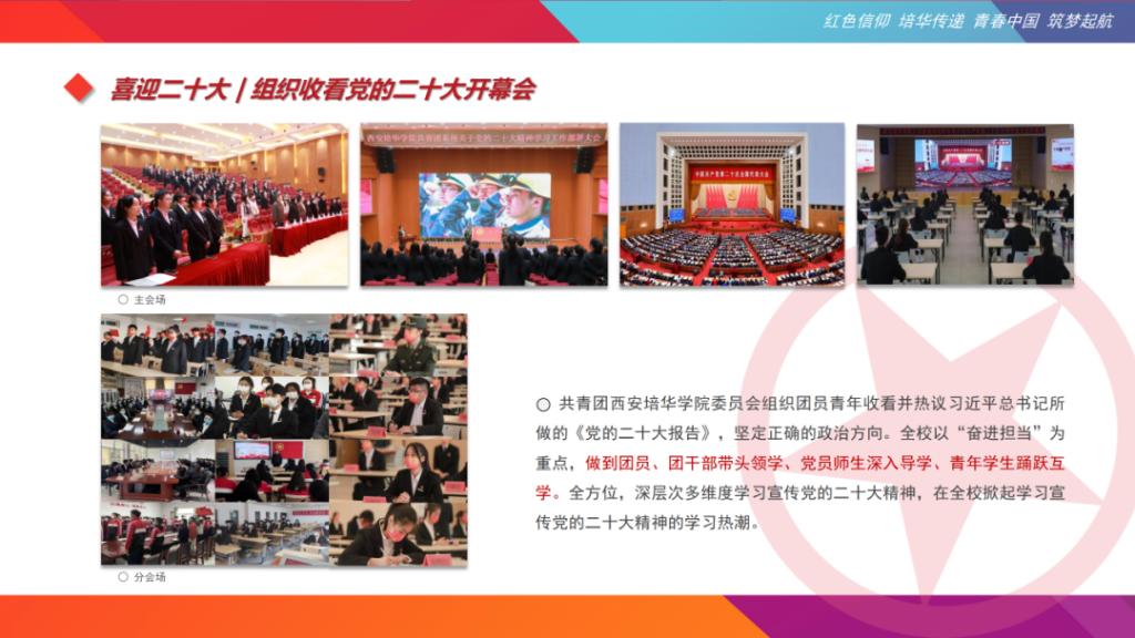 共青团西安培华学院委员会组织带领广大团员青年深入学习党的二十大精神,紧密团结在以习近平同志为核心的党中央周围,继续奋斗,不忘初心,砥砺前行,旗帜鲜明的引领广大团员青年坚定不移听党话、跟党走,紧紧围绕立德树人根本任务,引导学生树立坚定正确的理想信念,用理论宣讲武装青年、以“青马工程”培育青年、以先进典型感召青年。