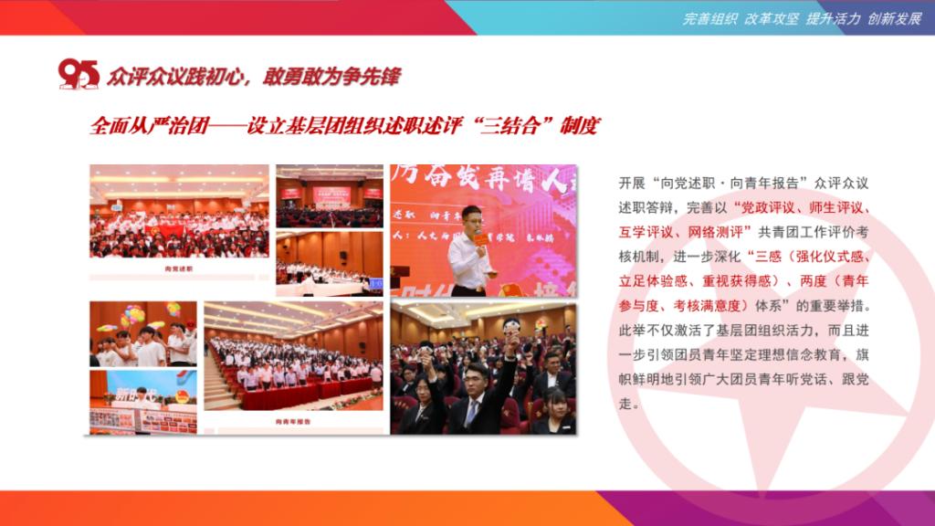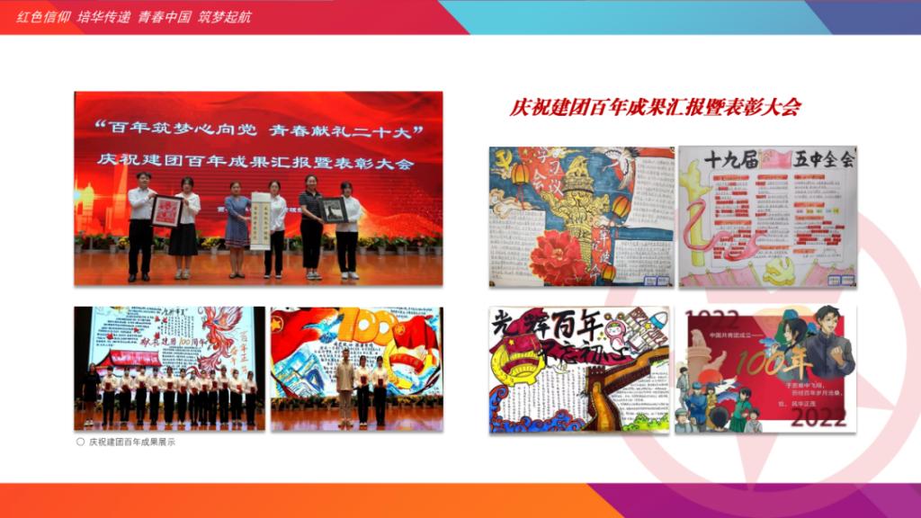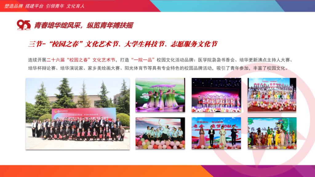 大潮泱泱,浩浩汤汤。同心汇聚,青年力量。五年改革,砥砺思想。发展创新,自信自强。校园文化,百花齐放。培华学子,风采万丈。社会实践,提升自我。立身为公,青年榜样。第二课堂,丰富多彩。志愿服务,永在路上。百团大战,百花齐放。一院一品,发挥特长。凝聚青年,服务大局。从严治团,当好桥梁。青年喜爱,团员满意。目标坚定,使命担当。