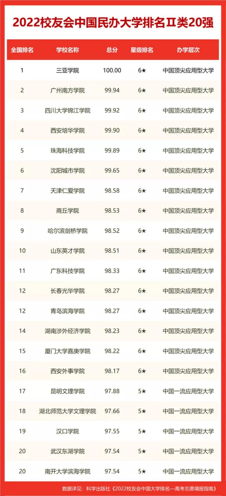 Ⅱ类院校为以理学及人文社科门类学科专业为优势的高校。三亚学院、广州南方学院、四川大学锦江学院、西安培华学院、珠海科技学院、沈阳城市学院、天津仁爱学院、商丘学院、哈尔滨剑桥学院、山东英才学院雄居2022校友会中国民办大学排名Ⅱ类10强。