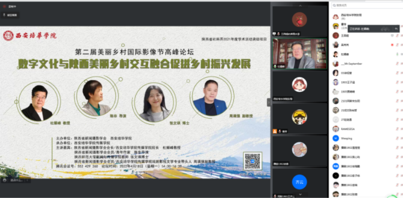 4月18日下午,由陕西省新闻摄影学会、西安培华学院主办,西安培华学院传媒学院承办的陕西省社科界社会组织学术活动资助项目“第二届美丽乡村国际影像节高峰论坛”在大赢家棋牌,受疫情影响,本次论坛采用腾讯会议线上形式展开。论坛主题为“数字文化与陕西美丽乡村交互融合促进乡村振兴发展”,由陕西省新闻摄影学会副会长、西安培华学院传媒学院常务副院长王西娅教授主持。
