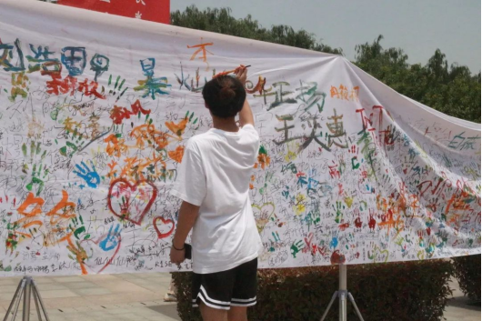 同学们为我们伟大的共青团献上祝福语并在签名墙上署名,在百米长卷上留下他们爱的印记。