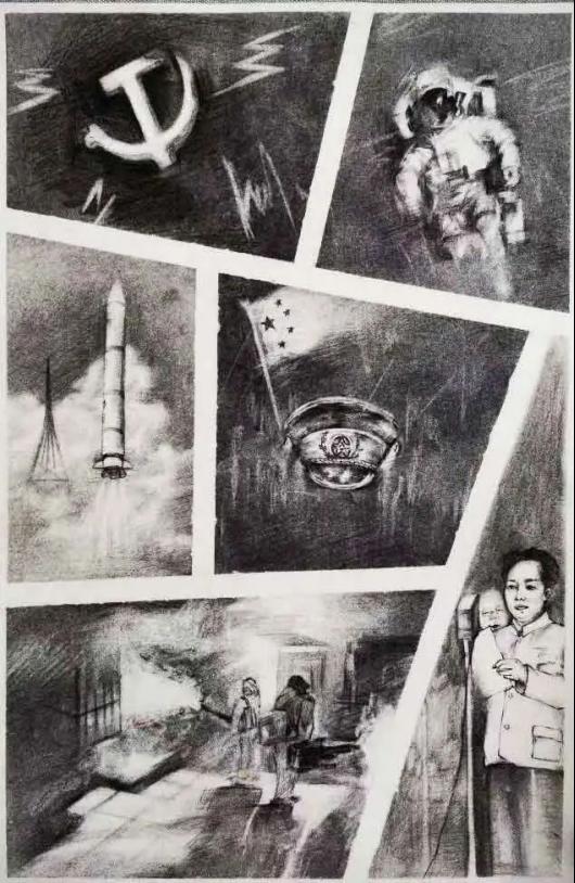 视觉传达专业杜承欢:作品采用了分镜方式,用“党徽”“国旗”“宇航员”“火箭”“医护人员”等不同元素,绘制出我们多年来的足迹与成就,表达永远跟党走的信仰、决心。