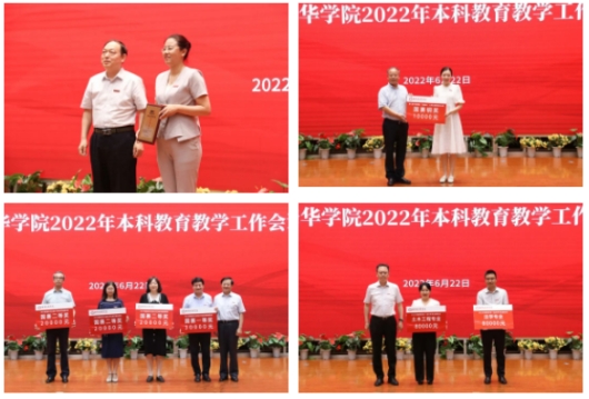 校领导分别为2021年度优秀校外实习基地、中国高等教育博览会“校企合作 双百计划”典型案例入选案例、第七届中国国际互联网+大学生创新创业大赛国赛获奖项目指导教师团队、2021年度全国大学生数学建模竞赛国赛获奖项目指导教师及2021年度陕西省一流本科专业建设点所在单位颁发了奖牌和奖金。