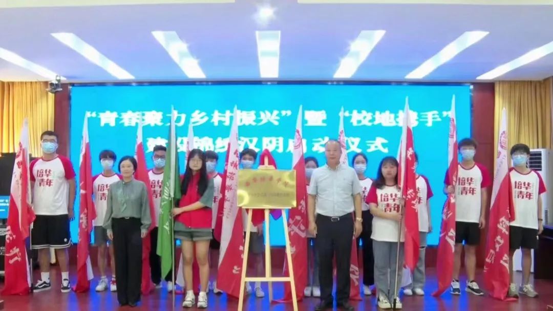会上,安康市少工委主任、市少先队总辅导员罗晓梅同志、西安培华学院党委书记罗新远还为“社会实践与劳动教育基地”揭牌,并为西安培华学院“青春聚力乡村振兴”汉阴专项实践团和中国农业大学农学结对助力锦绣汉阴社会实践队授旗。