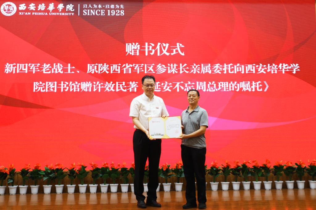新四军第5师老战士、原陕西省军区干部向西安培华学院向西安培华学院赠许效民著《延安不忘周总理的嘱托》书籍,姜波理事长代表学校颁发了捐赠证书。
