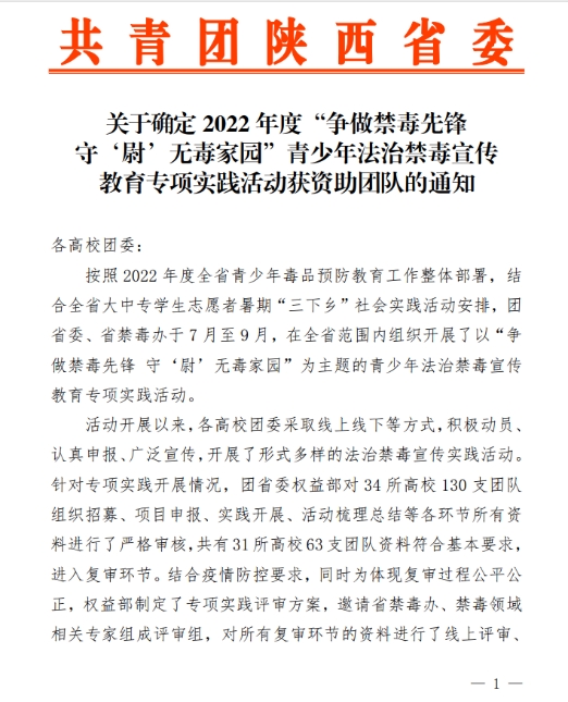 日前,共青团陕西省委发布了《关于确定2022年度“争做禁毒先锋守‘尉’无毒家园”青少年法治禁毒宣传教育专项实践活动获资助团队的通知》,,经评审组综合评定,共评选出一等资助3项、二等资助5项、三等资助22项,其中由学校推荐申报的《以青春之名,“培”你 健康成长》项目脱颖而出,荣获一等资助(5000元),位列全省资助项目第一名,这也是学校连续第三年获批专项资助。