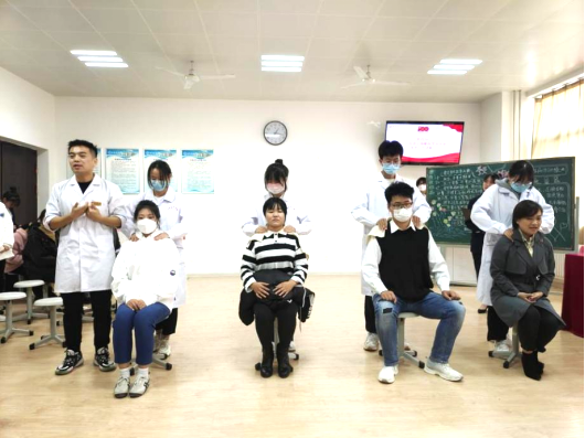 活动现场,护理学1905班学生代表表演中医健康拍打操。