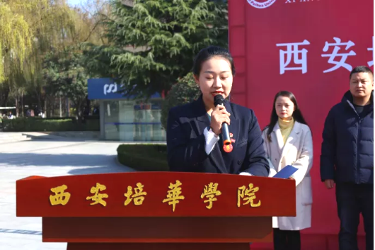西安培华学院校团委副书记杨媛老师首先对与会领导嘉宾的到来表示感谢,总结回顾了学校近年来志愿服务工作情况与工作实绩,并对今后的志愿服务工作提出了三点要求:一是要充分认识新时代志愿服务文化的重要意义。在广大青年学生中弘扬志愿服务精神。二是要不断创新志愿服务活动的时代内涵。新时代下的广大青年学生不仅要争做社会主义核心价值观的模范践行者,还要做一个爱党、爱国、爱人民、爱社会主义的时代新人,发扬学习中的“钉子精神”,更要苦练专业本领和技能,以实际行动弘扬志愿服务精神。三是要着力推动志愿服务活动扎实开展,各学院各专业要结合专业特色开展特色志愿服务活动。建立常态化机制,形成示范导向,营造良好舆论氛围,不断推动新时代志愿服务活动蓬勃发展。