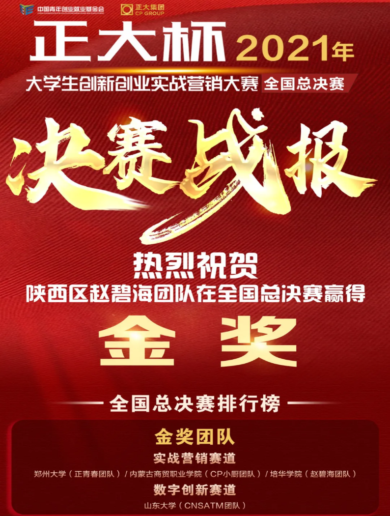 12月27日上午,正大杯2021年大学生创新创业实战营销大赛总决赛暨农业产业4.0人才发展高峰论坛如期举行。西安培华学院“赵碧海”团队以93.36高分获正大杯2021年大学生创新创业实战营销大赛总决赛金奖。