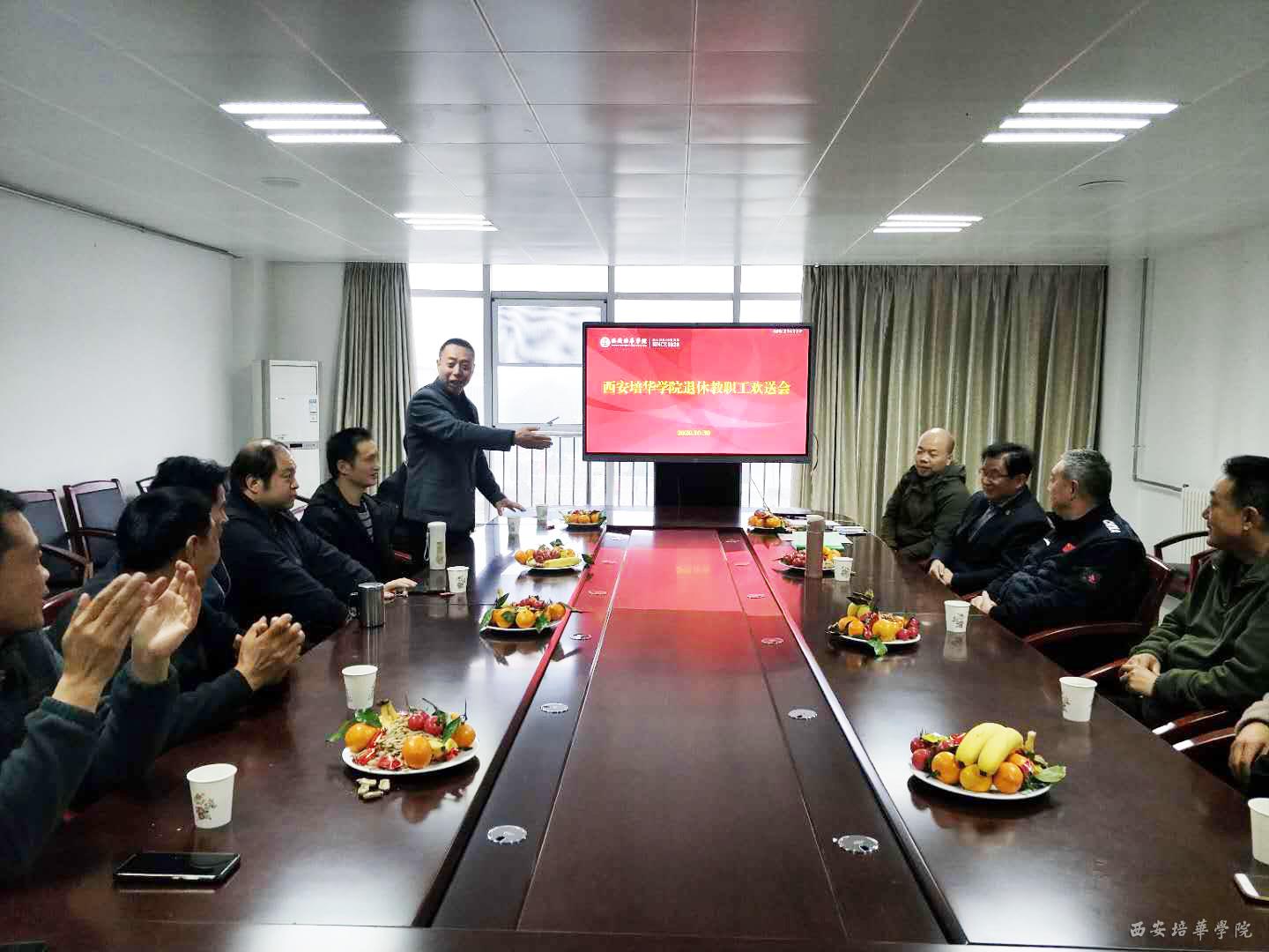 2020年10月30日下午,西安培华学院退休教职工欢送会在明德楼第四会议室举办,会议由党委副书记、工会主席徐国富主持,党委工作部部长陈玲、校长办公室主任李健、后勤服务中心主任赵维仪、副主任张静远及校车队全体驾驶员参加了欢送会。