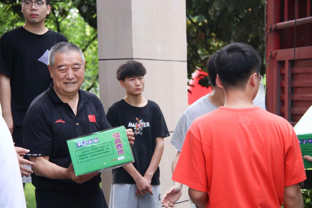 校长助理姜涛将400余斤西瓜等降温物资,送到了奋战在高温一线的基建人员手中,向他们表达祝福和感谢,并叮嘱工人时刻牢记高温季节施工安全注意事项,防止安全事故和高温中暑事件发生,确保人身安全。