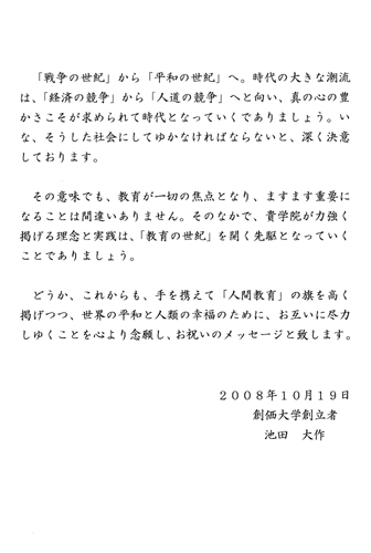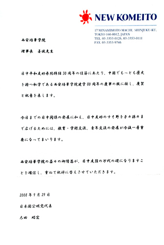 为庆典大会发来贺信及题词的领导有:全国人大常委副委员长、民革中央主席周铁农;全国政协副主席、农工民主党中央常务副主席陈宗兴;全国妇联主席、第十届全国人大副委员长、中国关工委主任顾秀莲;教育部常务副部长袁贵仁;国务院稽查特派员、中华教育艺术研究会理事长刘吉;国务院国资委国有资产监事会主席、北大国民素质研究中心主任解思忠;中国关工委副主任杨志梅;全国人大法制委副主任万绍芬;中国关工委执行主任、原中组部常务副部长王照华;原国家教委副主任、全国人大科教文卫委员会原副主任杨海波;原司法部部长邹瑜;原民政部部长崔乃夫;中国教育基金会理事长、原教育部常务副部长张保庆;中华国际民营企业促进会会长、原国家工商总局副局长、原国家工商行政管理局局经济检查司司长牛鸿瑞;中科院原副院长、中科院院士 2007国家科学技术获奖得者李振声;中国工程院院士孙九林;中华国际品牌协会会长、原中国质量管理协会理事长解艾兰;著名教育家、国学大师、演讲家、中华教育研究会常务副理事长李燕杰;陕西省省长袁纯清;陕西省委副书记、教工委书记王侠;原中共陕西省委书记张勃兴;原陕西省省长程安东;原陕西省政协副主席范明;日本执政党—公明党党首大田昭宏,日本政府内阁建设大臣国土厅长官中山正晖;日本创价学会名誉会长池田大作,京都市立艺术大学校长潮江宏三等。