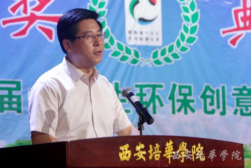 陕西省教育厅体卫艺处处长李鸣宣读表彰决定。陕西省十届人大常委会副主任、省决策咨询委员会副主任邓理发表讲话,他首先对获奖的师生表示祝贺,并希望环保大赛能够持之以恒的发展、提升创意水平、勤于思考、拓展规模,形成人人爱护环境的局面,凝聚各界力量共同致力于环保事业的发展当中,为建设“富裕陕西、和谐陕西、美丽陕西”做出自己应有的贡献。