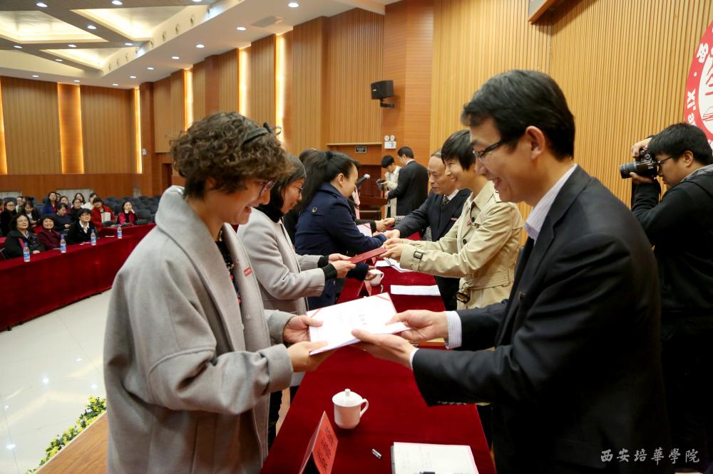 校领导为获得表彰的优秀女教职工颁发荣誉证书