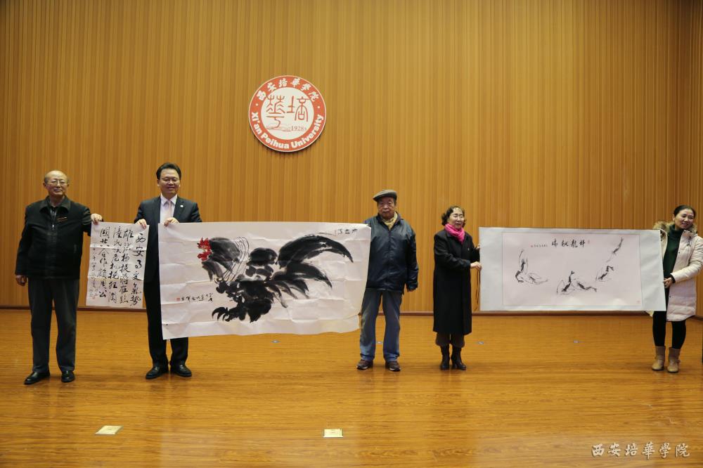 活动中, 原全国政协副主席汪锋孙女、陕西三秦红色文化传播中心副主任王珑介绍了2015年组织纪念抗战胜利70周年活动情况;西安铁路局文研会常务副会长、《清秋》杂志总编郑子云介绍《清秋》杂志第30-31 期纪念专刊社会评价情况;陕西皇城书画研究院院长陈聆、书画家周明智、吕瑞萍依次向陕西省红色文化研究院、陕西三秦红色文化传播中心赠送书画作品; 我校姜波理事长向参加本次大会的革命先烈后人颁发活动纪念勋章。