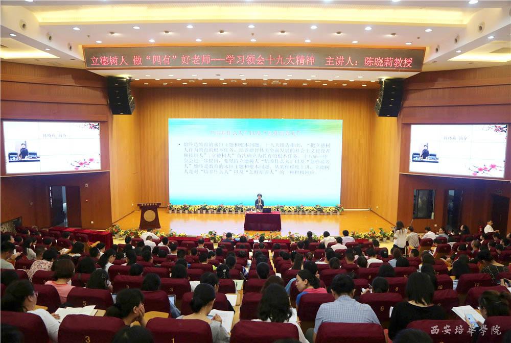 7月11日,我校特邀西安财经大学马克思主义学院陈晓莉教授来校,在维之图书馆报告厅作以“立德树人 做‘四有’好老师——学习领会十九大精神”为主题的党务专题培训。学校副校长刘越莲,党委副书记、副校长姚文静,党委副书记、副校长徐国富,中层以上干部,全体教师党员、辅导员、党总支直属支部书记、党群系统干部等400余人参加了培训。