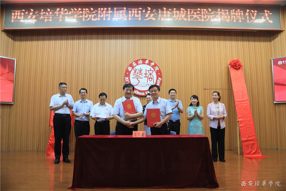 仪式上,学校校长李映方,唐城医院党委书记兼执行院长郑瑞世代表校院双方签订了战略合作协议。与会的领导为西安培华学院附属医院、西安唐城医院临床教学基地揭牌。
