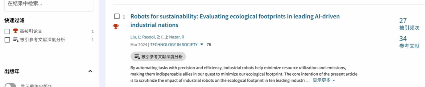 该论文以“Robots for sustainability: Evaluating ecological footprints in leading AI-driven industrial nations”为题,于2024年3月发表于国际顶尖SSCI期刊《Technology in Society》。据悉,该期刊由Elsevier出版,JCR分区为Q1,2025年影响因子达12.5分,在社会问题与跨学科社会科学领域排名稳居前1%,是全球该领域极具影响力的学术平台。