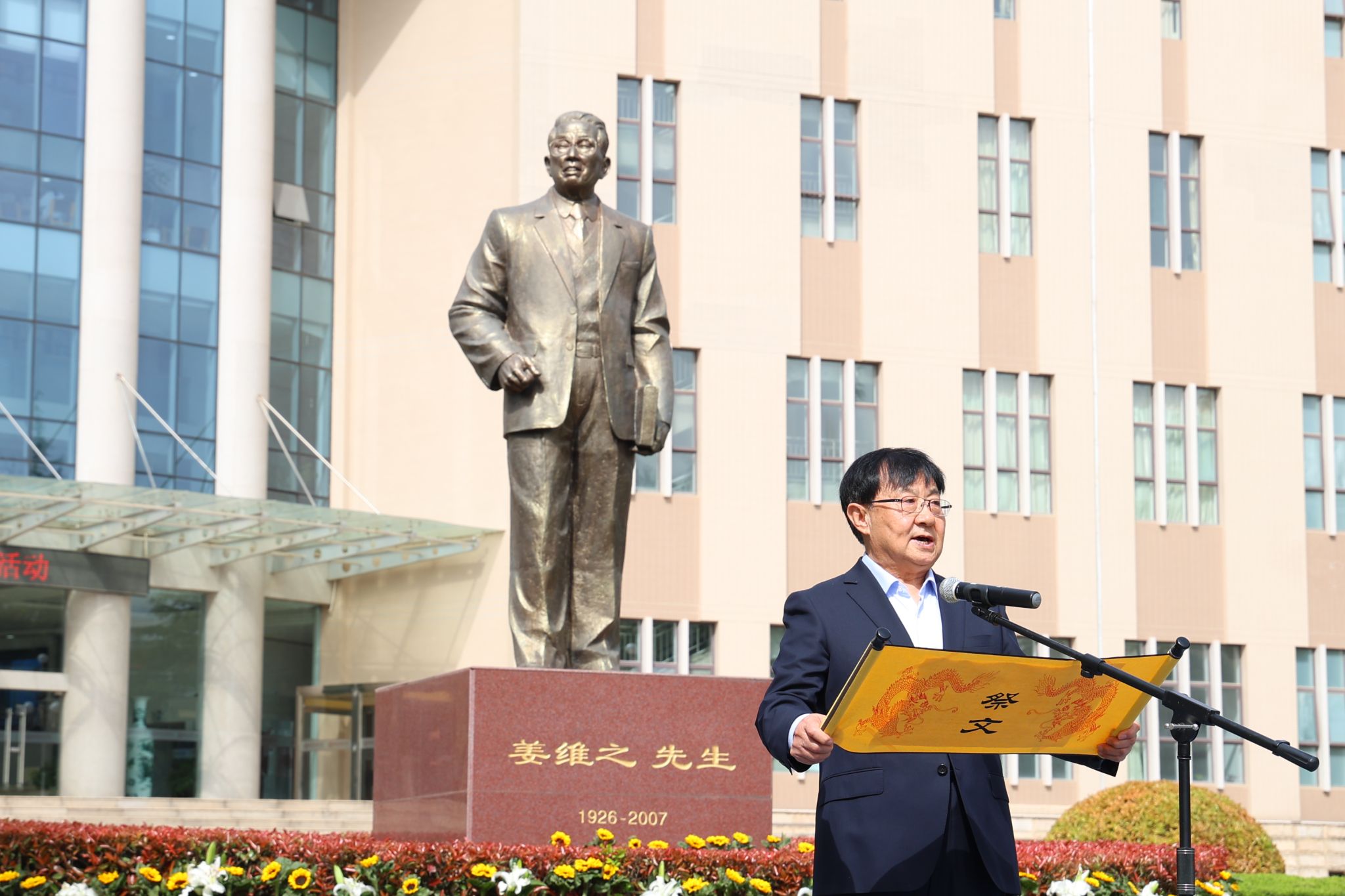 随后,校长李映方缓步上前,行三鞠躬礼,恭读祭文。祭文以四言古体成文,饱含着对姜维之先生的追思与敬意。祭文循着先生生平足迹,从南阳少年心怀教育热忱,到执鞭培华;从反右运动中蒙冤二十载仍坚守教育初心,到平反后恢复创办西安培华女子大学,皆历历呈现。文中彰显了先生“以产养教”“产教结合”的办学理念,赞颂了他爱校如家、爱生如子、克己奉公的品格。祭文后半段追述了如今培华在学科建设、人才培养、社会服务等方面取得的成果,展现了先生办学理念的传承。文末以“愿承遗志,直前勇往,再创辉煌”作结,既是对先生的告慰,也凝聚起全体培华人继往开来的力量。