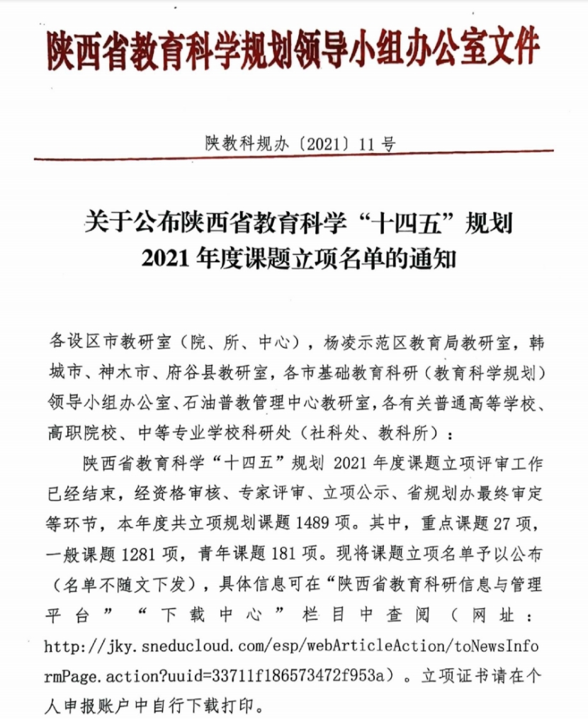 近日,陕西省教育科学规划领导小组办公室发布通知,2021年度陕西省教育科学“十四五”规划课题立项评审工作已经结束,经资格审核、专家评审、立项公示、省规划办最终审定等环节,本年度共立项规划课题1489项。其中,重点课题27项,一般课题1281项,青年课题181项。