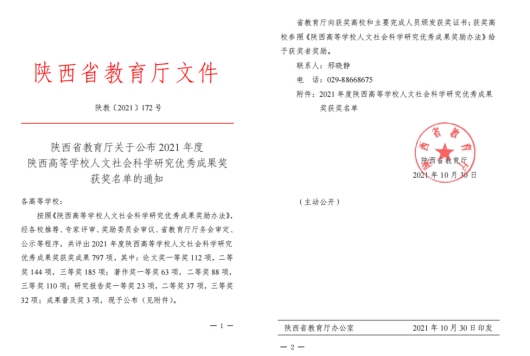 按照《陕西高等学校人文社会科学研究优秀成果奖励办法》,经各校推荐、专家评审、奖励委员会审议、省教育厅厅务会审定、公示等程序,共评出2021年度陕西高等学校人文社会科学研究优秀成果奖获奖成果797项,其中,西安培华学院魏耕原教授的论文《<史记>互见法论》,荣获2021年度陕西高等学校人文社会科学研究优秀成果奖论文类三等奖。