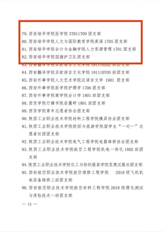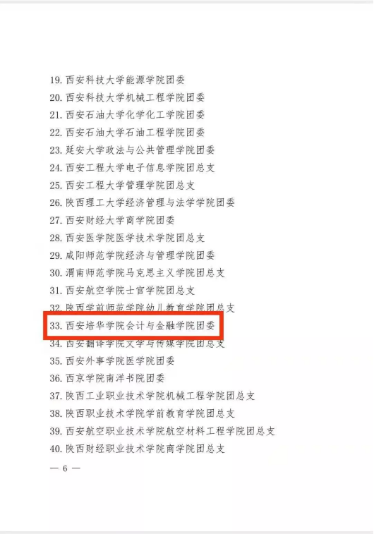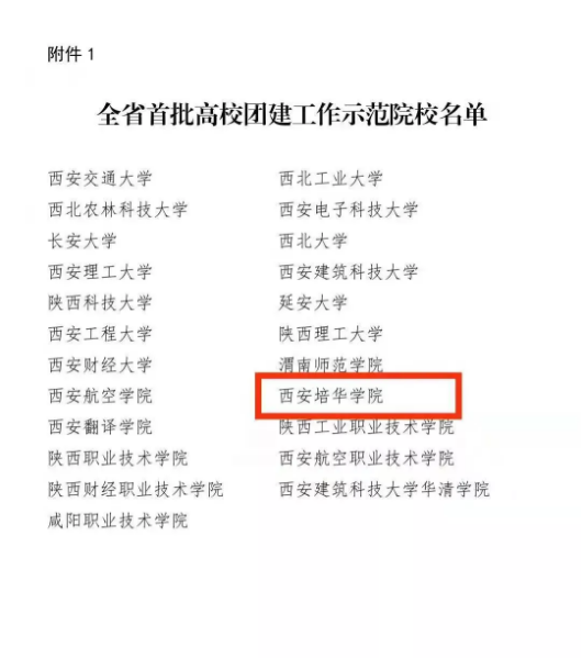 近日,由共青团陕西省委 中共陕西省教育工委发布的《关于全省首批新时代高校团建示范创建结果的通报》中,培华荣获“全省首批高校团建工作示范院校”称号,学校会计与金融学院团委荣获“全省首批高校团建工作标杆院系”称号,5个团支部荣获“全省首批高校团建工作样板团支部”称号,“以团干部素质能力大赛为抓手筑牢高校共青团‘铸魂育人’的政治使命”工作案例入选全省首批高校团建创建工作案例。