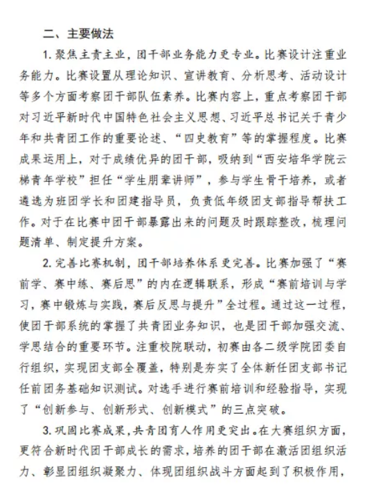 校党委进一步强化党建带团建,修订了《中共西安培华学院委员会2021年基层党建工作目标考核办法》,确立了对二级学院党委考核团建内容占比10分,校党委定期研究团学工作,配齐配强校院两级团干部队伍。