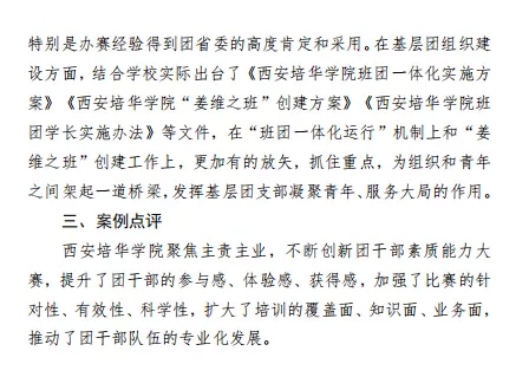 坚持“一切工作到支部”落到实处,出台了《西安培华学院‘姜维之班’创建方案(修订)》、《西安培华学院班团一体化运行实施方案(试行)》等文件,进一步为基层团组织赋能,激活了基层团组织的活力和战斗力。