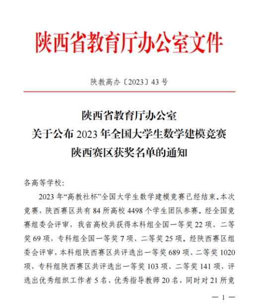 12月13日,陕西省教育厅办公室公布了2023年全国大学生数学建模竞赛陕西赛区获奖名单。我校共获国家级奖项3项,省级奖项15项,其中,智能科学与信息工程学院计算机科学与技术专业王鹏欢、王梅和安梦赫三位学生的作品获评本科组国家一等奖,计算机应用技术专业李泽文、张朝伟和陈旭哲三位同学的作品被评为专科组国家一等奖,计算机应用技术专业陈涛涛、王佳杰和边文杰三位同学的作品被评为专科组国家二等奖,同时,我校也连续两年获评陕西赛区优秀组织工作奖。