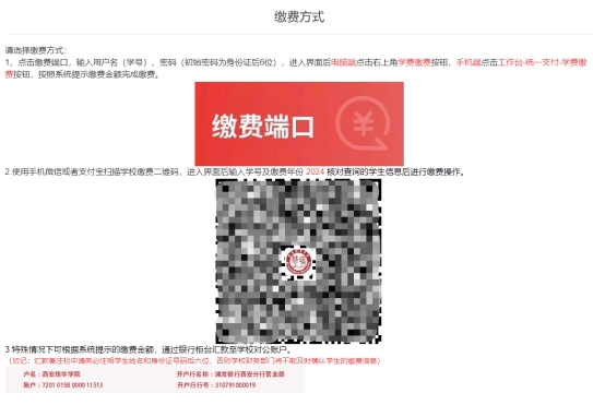 缴费前请仔细阅读迎新网首页《西安培华学院2024级新生缴费指南》;请不要向任何人透漏自己缴费信息和缴费通道,由此造成的损失,由本人负责。
