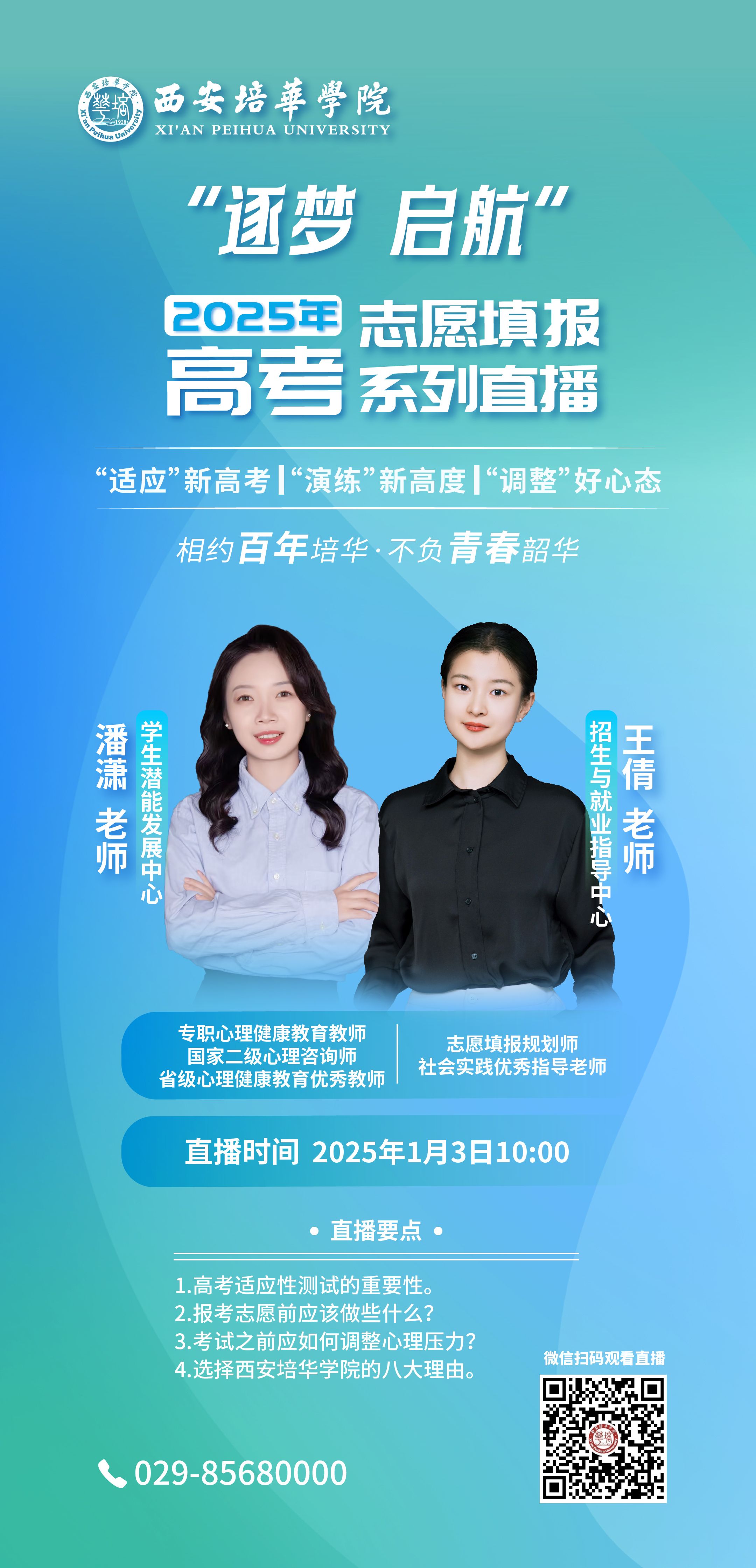 系列直播将于1 月 3 日 10:00 开启,首场直播以“2025年高考适应性演练”为主题,由王倩、潘潇两位经验丰富的老师坐镇,为大家带来专业贴心的指导及互动答疑。本场直播内容囊括了考生和家长最关心的几大要素:解读高考适应性测试的重要意义,这是考生了解自身水平、适应高考节奏的关键一步;详细介绍模拟报考志愿前的准备工作,避免考生在填报志愿时盲目行事;重点讲解考试前如何有效调整心理压力,让考生以最佳状态迎接高考;深入解析西安培华学院招生政策、办学特色等,为考生的未来求学之路提供优质选择。